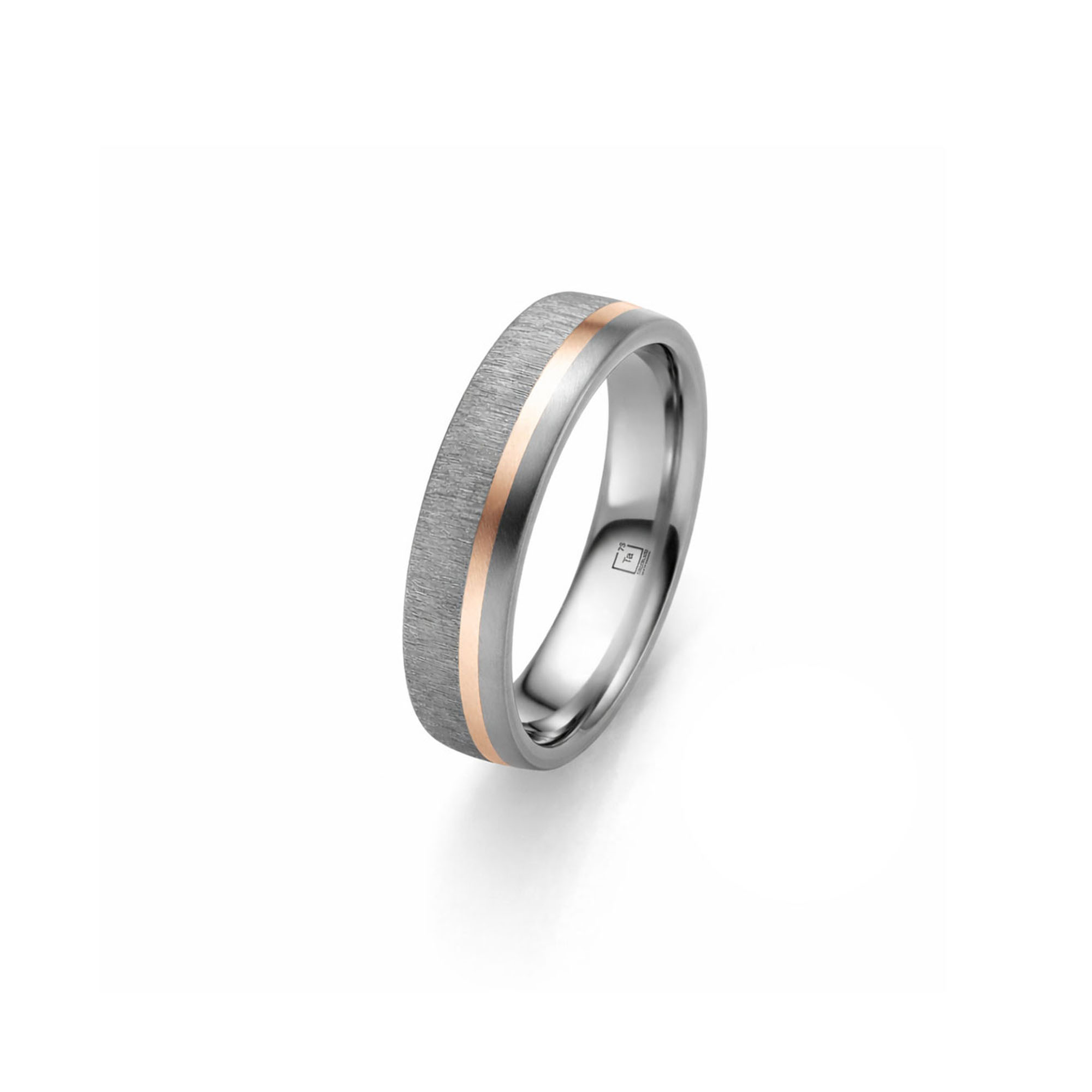 Der Herrenring ist verziert mit einer 1mm breiten Einlage aus 750 Au Rotgold. Die Oberfläche Rough macht den Ring zu einem absoluten Highlight.