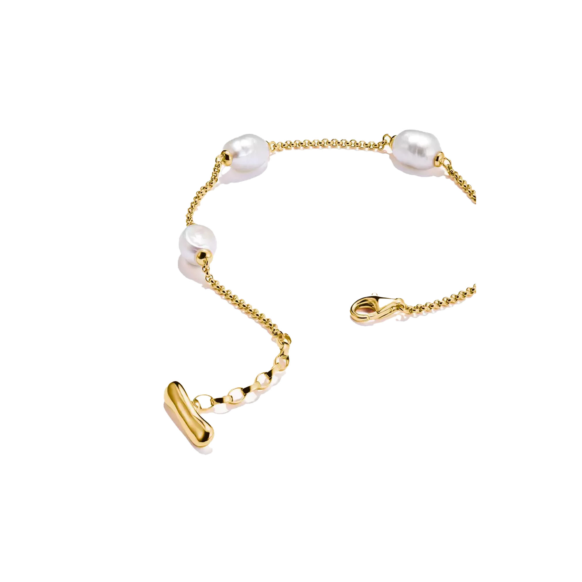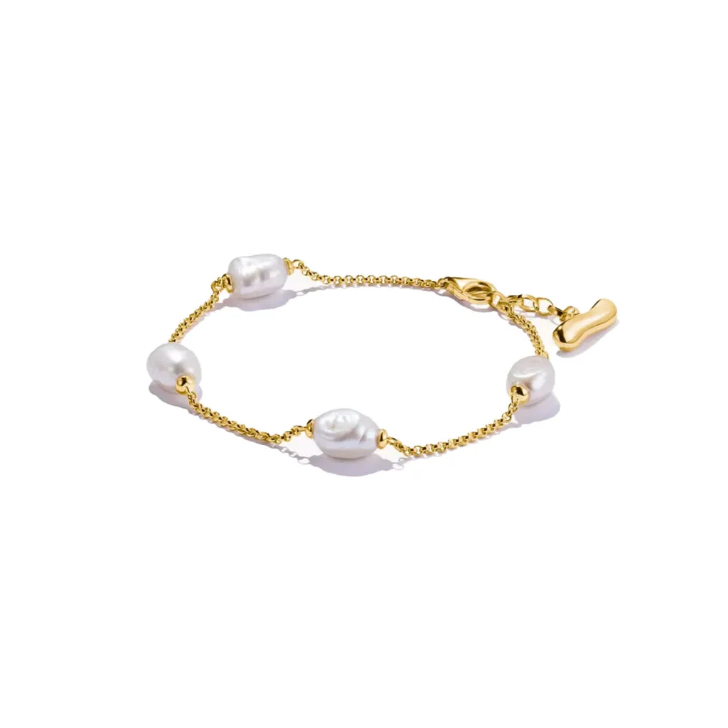 Eleganter Armschmuck mit modernem Twist: Das feine Armband besteht aus recyceltem 925 Sterling Silber und ist mit einer hochwertigen 18k Vergoldung versehen. Es ist mit viel Sorgfalt und nachhaltig von Hand gearbeitet. Hingucker des feinen Armbands sind 4 einzigartig geformte Süßwasser-Zuchtperlen, welche die Schönheit der Natur und die seiner TrägerInnen feiern.