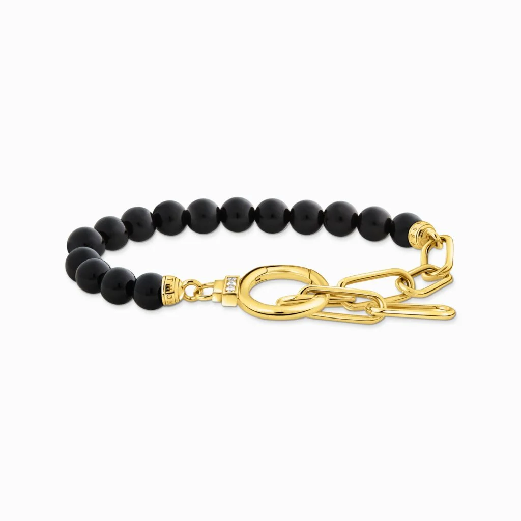 Zeitloser Kontrast: Das außergewöhnliche Armband verbindet schwarze Onyx-Beads und polierte Ankerelemente aus hochwertigem 925er Sterlingsilber, die mit 750er Gelbgold hochkarätig vergoldet sind. Dadurch entsteht eine spannende Liaison aus edlem Purismus und modernen Klassik. Der auffällige Ringverschluss ist fein mit Zirkonia-Steinen in Weiß besetzt. Mit seiner Hilfe lässt sich die Länge des Armbands von 16 bis 19cm ans Handgelenk anpassen. Das goldfarbene Gliederarmband mit Onyx ist zu einem besonderen Anlass eine hervorragende Geschenkidee. Perfekte Ergänzung ist das Collier im gleichen Design von THOMAS SABO.
